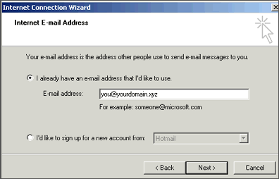 4. Put in your email address, which consists of a user you set up in webmail and @yourdomain.xyz, and then click Next.